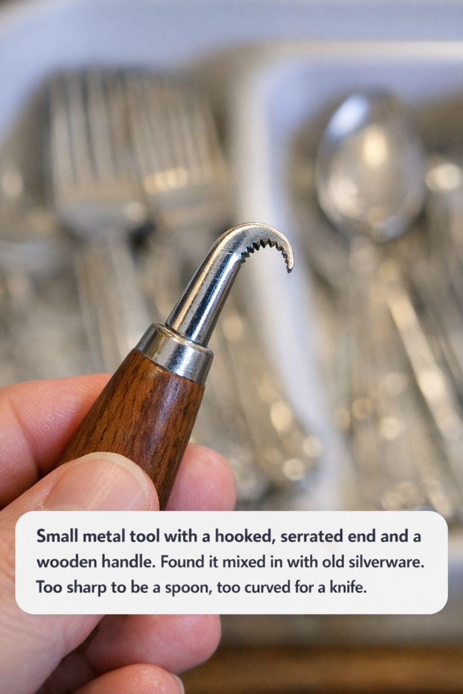 In the world of vintage kitchenware, one can stumble upon many intriguing and mysterious tools, each with its own unique history and purpose. Among these curiosities, you may find a small metal tool with a hooked, serrated end and a wooden handle, nestled among old silverware. At first glance, its function may not be immediately apparent, as it doesn't conform to the typical shapes and edges of common utensils like spoons, forks, or knives.