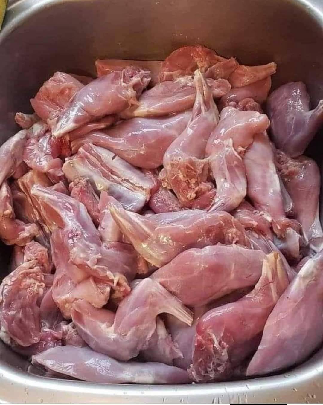 The image shows small, very thin legs, with thin bones and little fat. They are narrow and slightly curved, typical of frog legs (frog meat).